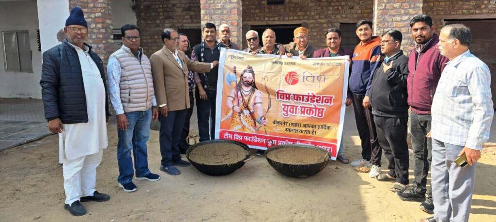 मौनी अमावस्या के पावन एवं पुण्यकारी अवसर पर विप्र फाउंडेशन युवा प्रकोष्ठ, बीकानेर (शहर) द्वारा गौ सेवा के अंतर्गत गौ माताओं को लापसी का भोग अर्पित करने का पावन कार्यक्रम श्रद्धा, आस्था एवं भक्ति भाव के साथ सफलतापूर्वक संपन्न हुआ। यह आयोजन डेहरु माताजी मंदिर परिसर, जैसलमेर रोड पर आयोजित किया गया, जिसमें संगठन के पदाधिकारी, कार्यकर्ता एवं विप्र समाज के अनेक गणमान्यजनों की गरिमामयी उपस्थिति रही।