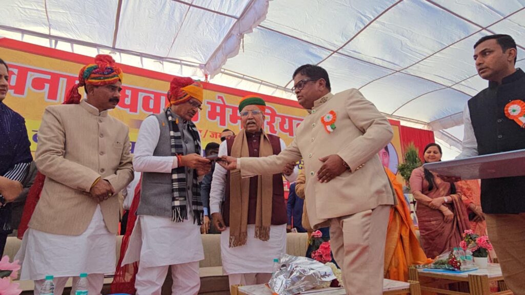 भाजपा नेता महावीर रांका ने राष्ट्रीय स्वयं सेवक संघ के शताब्दी वर्ष पर जारी 100 रुपए के सिक्के केन्द्रीय कृषि मंत्री एवं केन्द्रीय सड़क परिवहन मंत्री को प्रतीक चिह्न के रूप में भेंट किए। महावीर रांका ने बताया कि भावना मेघवाल मेमोरियल ट्रस्ट द्वारा विगत दो दशकों से सामूहिक विवाह समारोह आयोजित कर पुण्य का कार्य किया जा रहा है। केन्द्रीय कानून मंत्री अर्जुनराम मेघवाल द्वारा अपनी दिवंगत पुत्री की स्मृत्ति को अक्षुण्ण बनाए रखते हुए सैकड़ों बेटियों के जीवन की ज्योति प्रकाशित की है। इस दौरान प्रतिभा सम्मान समारोह तथा नशा मुक्ति अभियान की भी शुरुआत की गई।