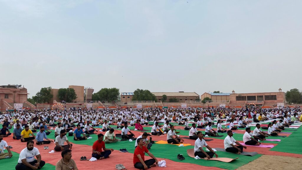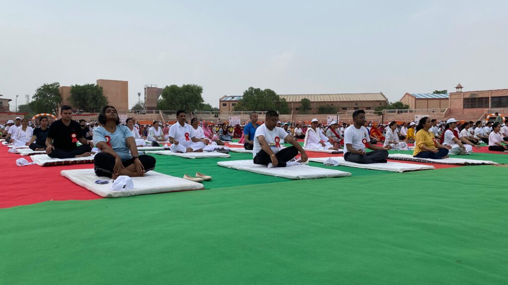 ग्यारहवें अंतराष्ट्रीय योग दिवस के अवसर पर शनिवार को जिला मुख्यालय से लेकर गांव-गांव तक हजारों लोगों ने सामूहिक योगाभ्यास किया और ‘आरोग्यता’ एवं ‘वसुधैव कुटुंबकम’ का संदेश दिया। एक पृथ्वी और स्वास्थ्य के लिए योग’ थीम के साथ योग दिवस का जिला स्तरीय समारोह डॉ. करणी सिंह स्टेडियम में आयोजित हुआ। जिला प्रशासन और आयुर्वेद विभाग के संयुक्त तत्वावधान में आयोजित कार्यक्रम में श्री यादें माटी कला बोर्ड के अध्यक्ष श्री प्रहलाद राय टाक ने प्रातः 6.15 बजे दीप प्रज्वलन कर कार्यक्रम की शुरुआत की।
